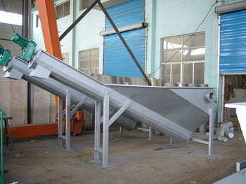 砂水混合物從頂部的法蘭接管進(jìn)入儲(chǔ)液箱內(nèi)。箱內(nèi)專門(mén)設(shè)計(jì)的散水盤(pán)使水匯集于下水槽。砂水混合夜中,砂石逐漸沉淀于下部的螺旋u形槽內(nèi)?招膸铰菪徛D(zhuǎn)砂礫推向上出口,自然脫水排除。